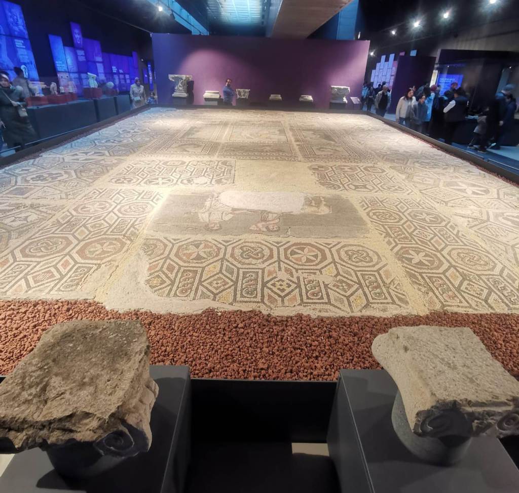 Henüz iki adım atmıştım ki şaşkınlığım daha da arttı. On bir, on iki yaşlarımda hayatımda ilk defa gördüğüm mozaik yanı başımdaydı. O yaşlarda tepeden bakarak tamamını görebiliyordum ama şimdi imkansızdı. Ne demek istediğimi eski yeni fotoğraflar bir arada daha iyi anlatabilirim sanırım. Niye tamamını göremiyordum çünkü taban mozaiği yerden 50-60cm yükseltilmiş bir platform üzerinde duruyordu. Çok az eğim de olsa nereden bakarsanız bakın tamamını algılamak çok güçtü. Adı üzerinde taban mozaiği bir villanın tabanına yapılmış ve yukarıdan bakmamız gerekiyor. Eski müzede geçtiğimiz yüz yılda birileri bunu düşünmüş ve bir kaç basamak çıkarak üst kottan izleme imkanı sunmuş.